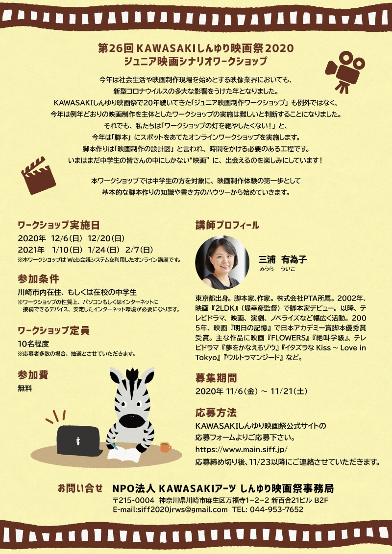 Kawasakiしんゆり映画祭 On Twitter ジュニア映画シナリオワークショップのお知らせ オンラインで映画シナリオワークショップを開催 いよいよ今日から 参加中学生の募集を開始します 詳しくは映画祭hpをご覧ください Https T Co Jdly1tquu5 しんゆり映画